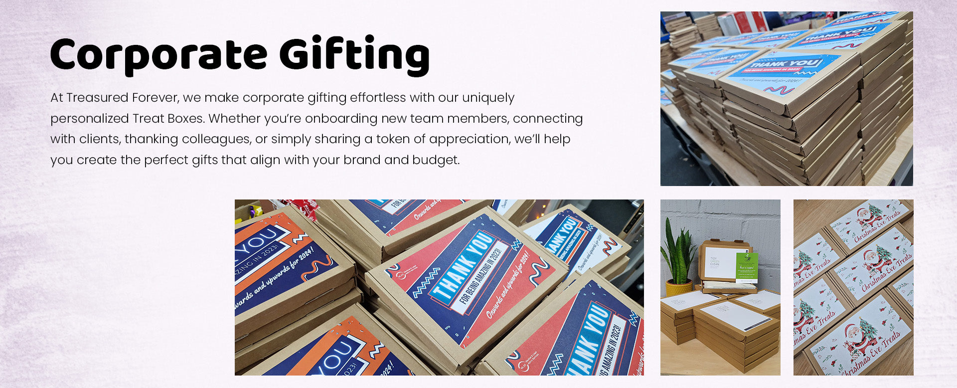At Treasured Forever, we make corporate gifting effortless with our uniquely personalized Treat Boxes. Whether you’re onboarding new team members, connecting with clients, thanking colleagues, or simply sharing a token of appreciation, we’ll help you create the perfect gifts that align with your brand and budget.